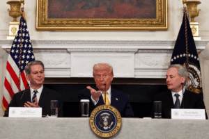 De izquierda a derecha, el secretario del Tesoro de EE UU, Scott Bessent, el presidente Donald Trump, y el responsable de la política de criptomonedas, David Sacks, en una reunión en la Casa Blanca.